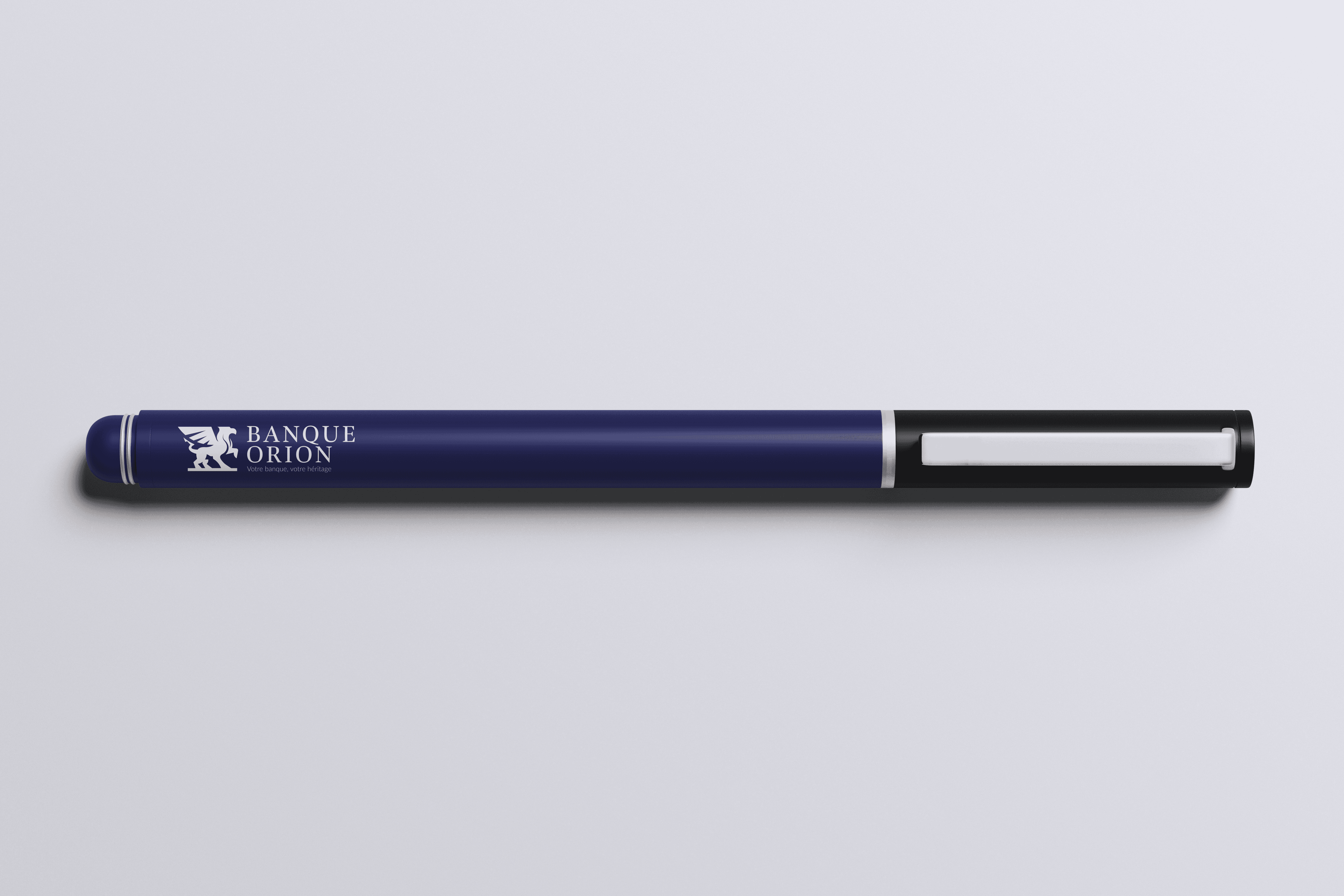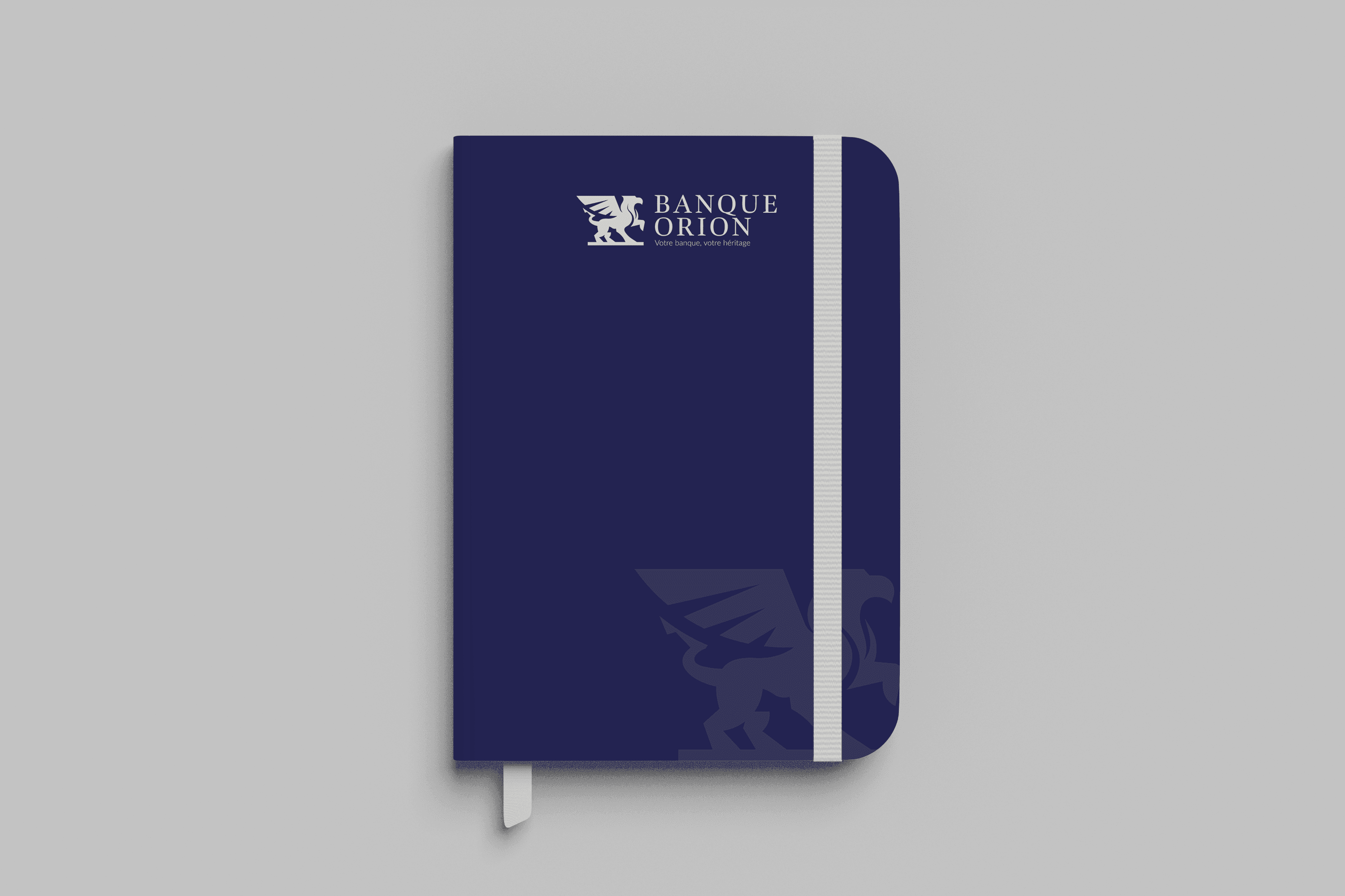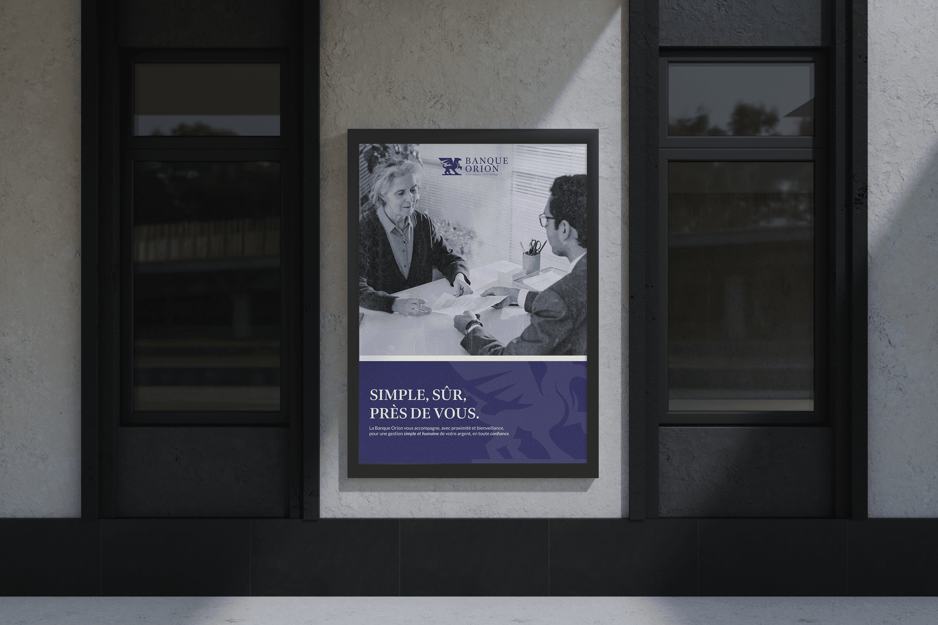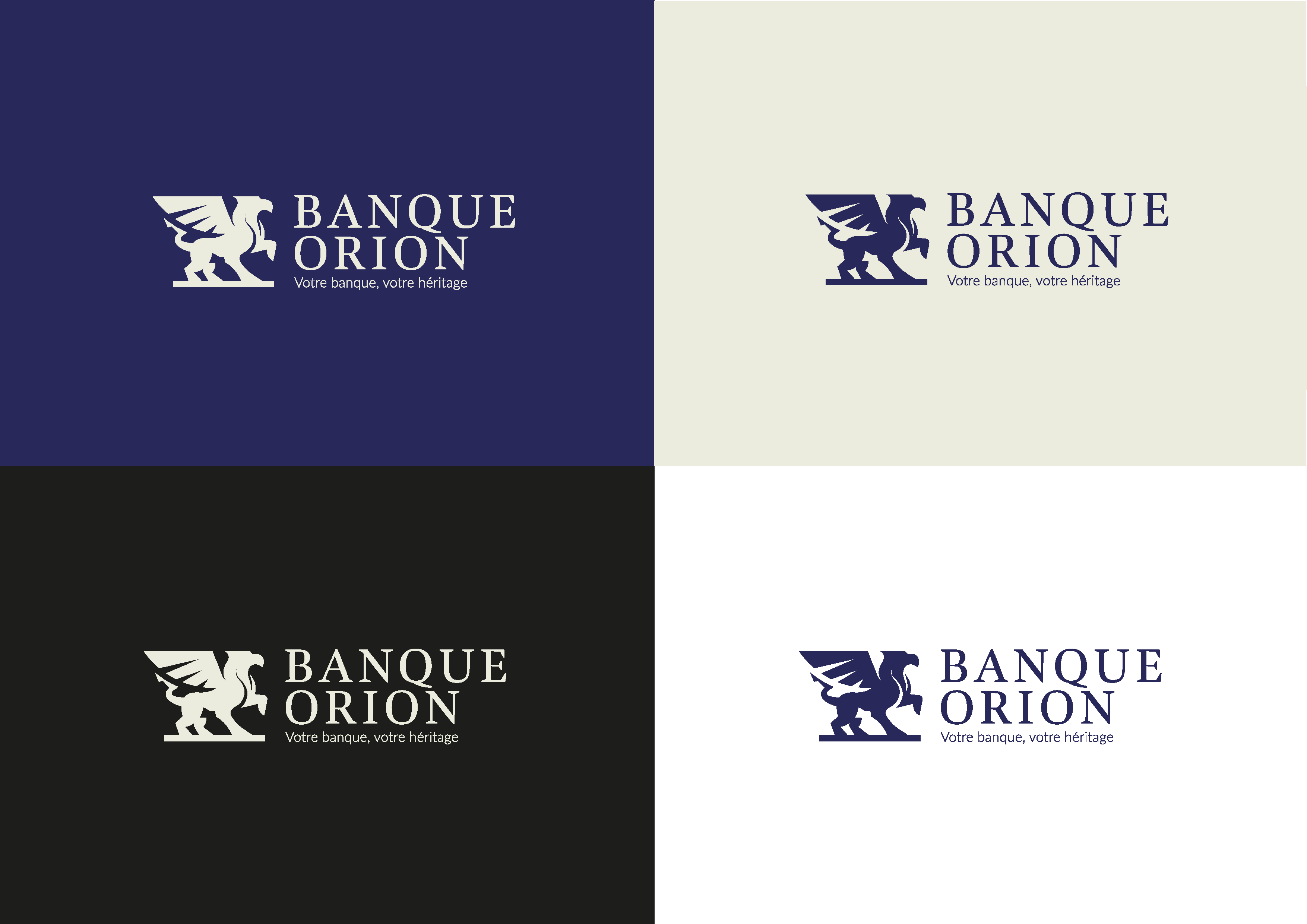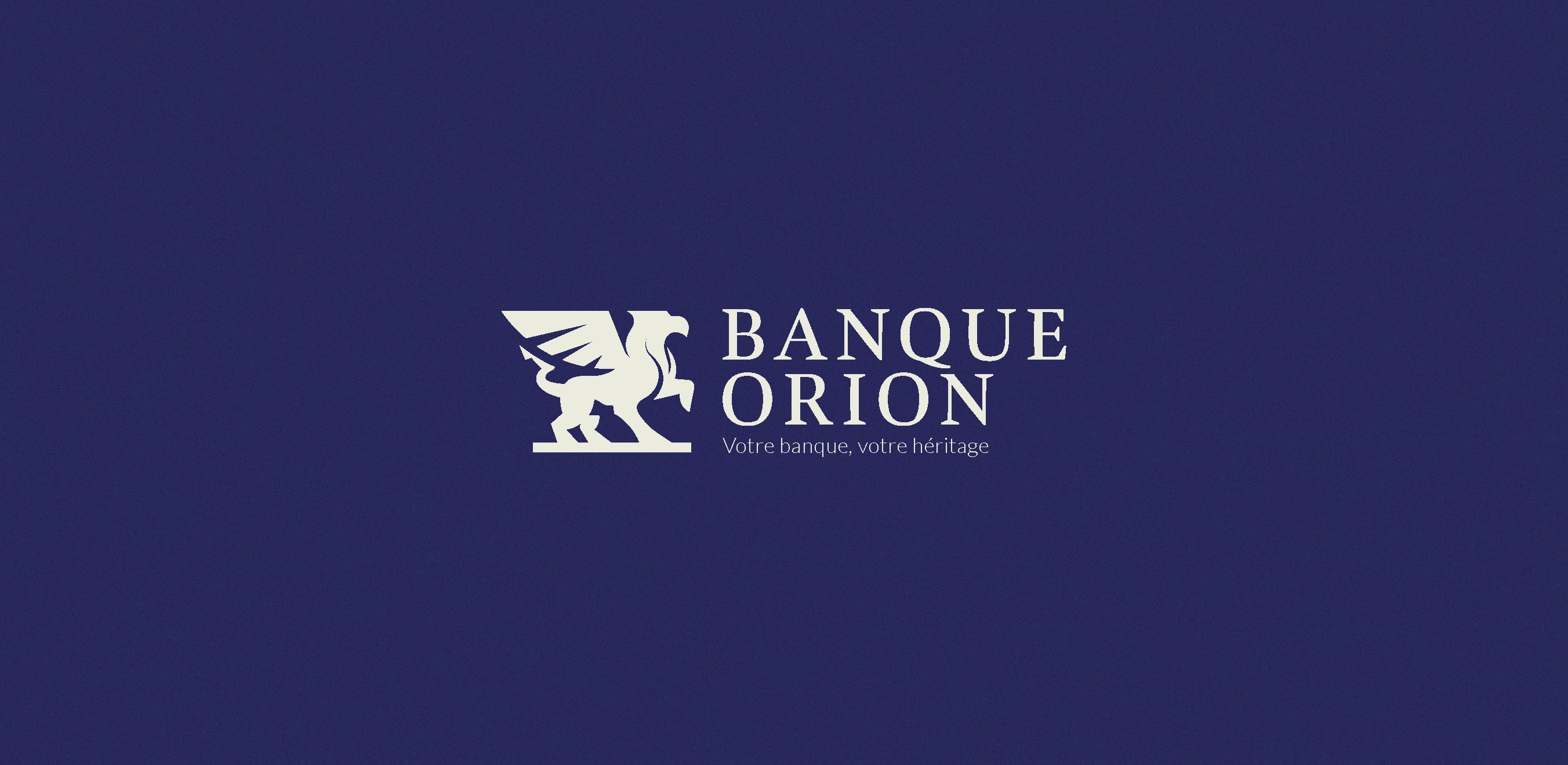 L’identité de la Banque Orion s’appuie sur deux symboles : le griffon, choisi pour représenter stabilité, vigilance et protection, et la constellation d’Orion, évoquant un repère fiable et rassurant. Ensemble, ils incarnent une institution pensée pour offrir confiance et proximité à un public éloigné du numérique. La palette — bleu profond, noir, beige clair et blanc — renforce cette idée de fiabilité, de sobriété et d’authenticité.