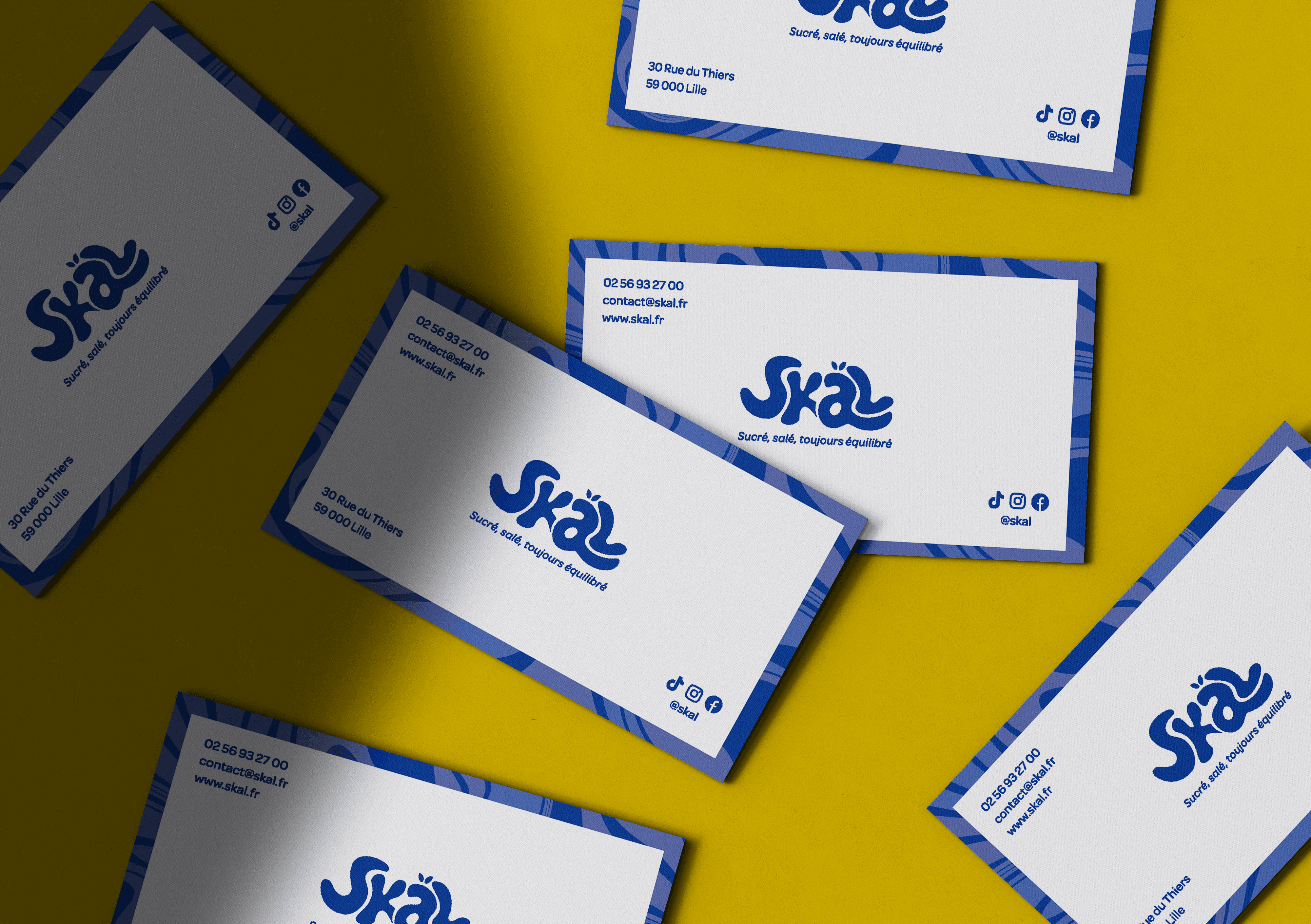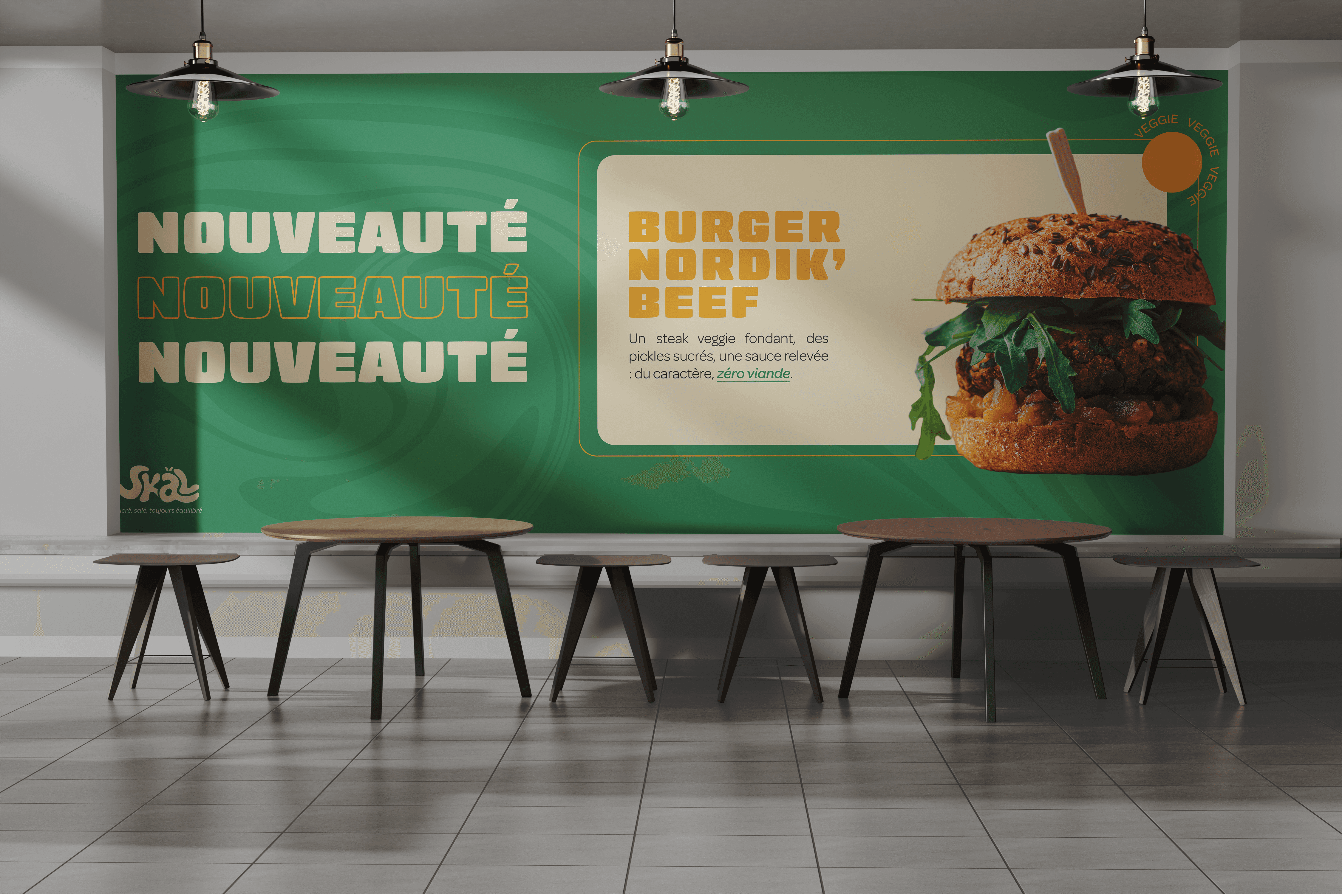 La palette associe un bleu vif, un jaune solaire et un vert doux pour exprimer fraîcheur, gourmandise et engagement naturel. Le logo, avec ses formes arrondies et son rythme aéré, traduit une identité moderne et généreuse, tandis que la feuille au-dessus du A évoque subtilement la nature et la fraîcheur nordique.