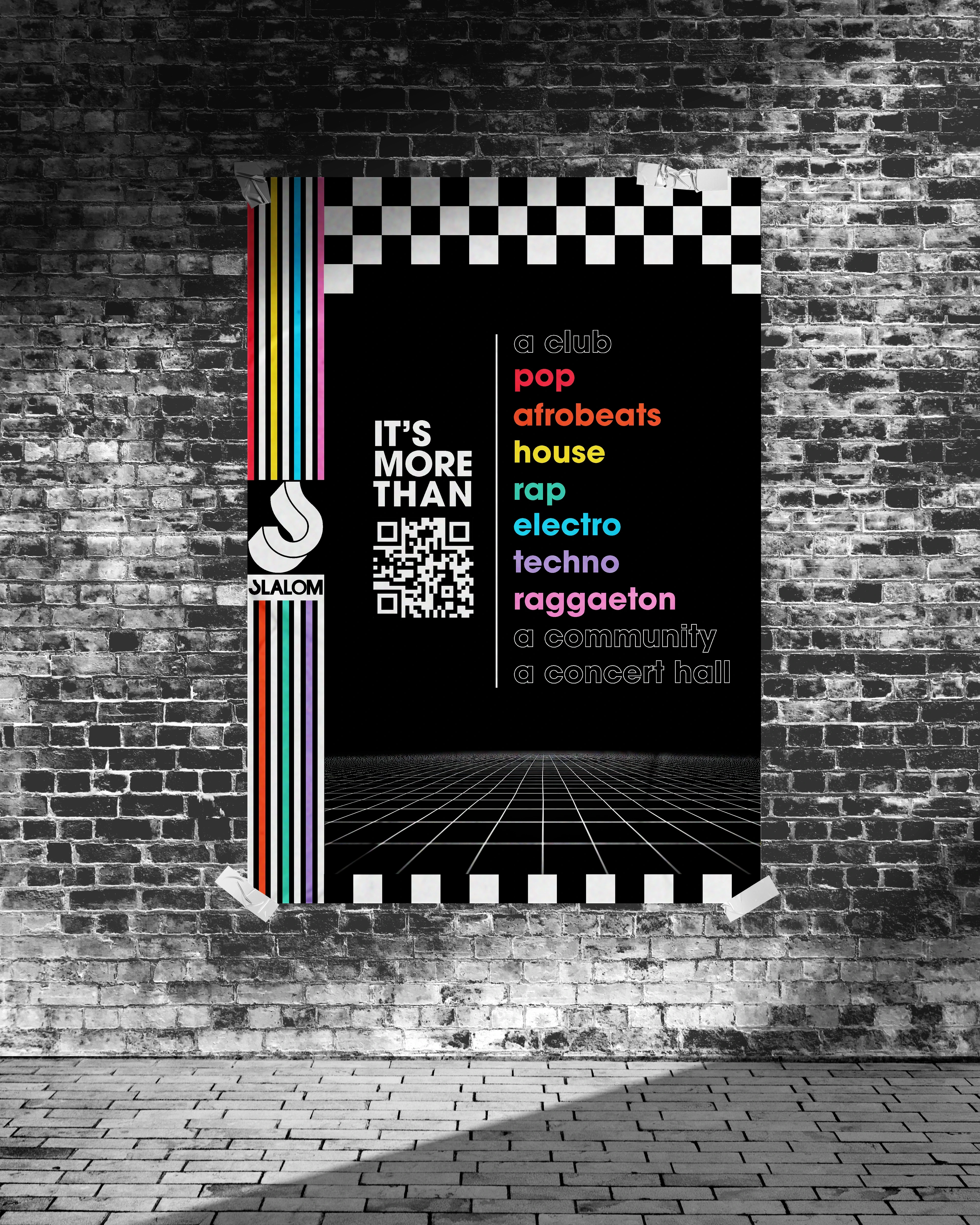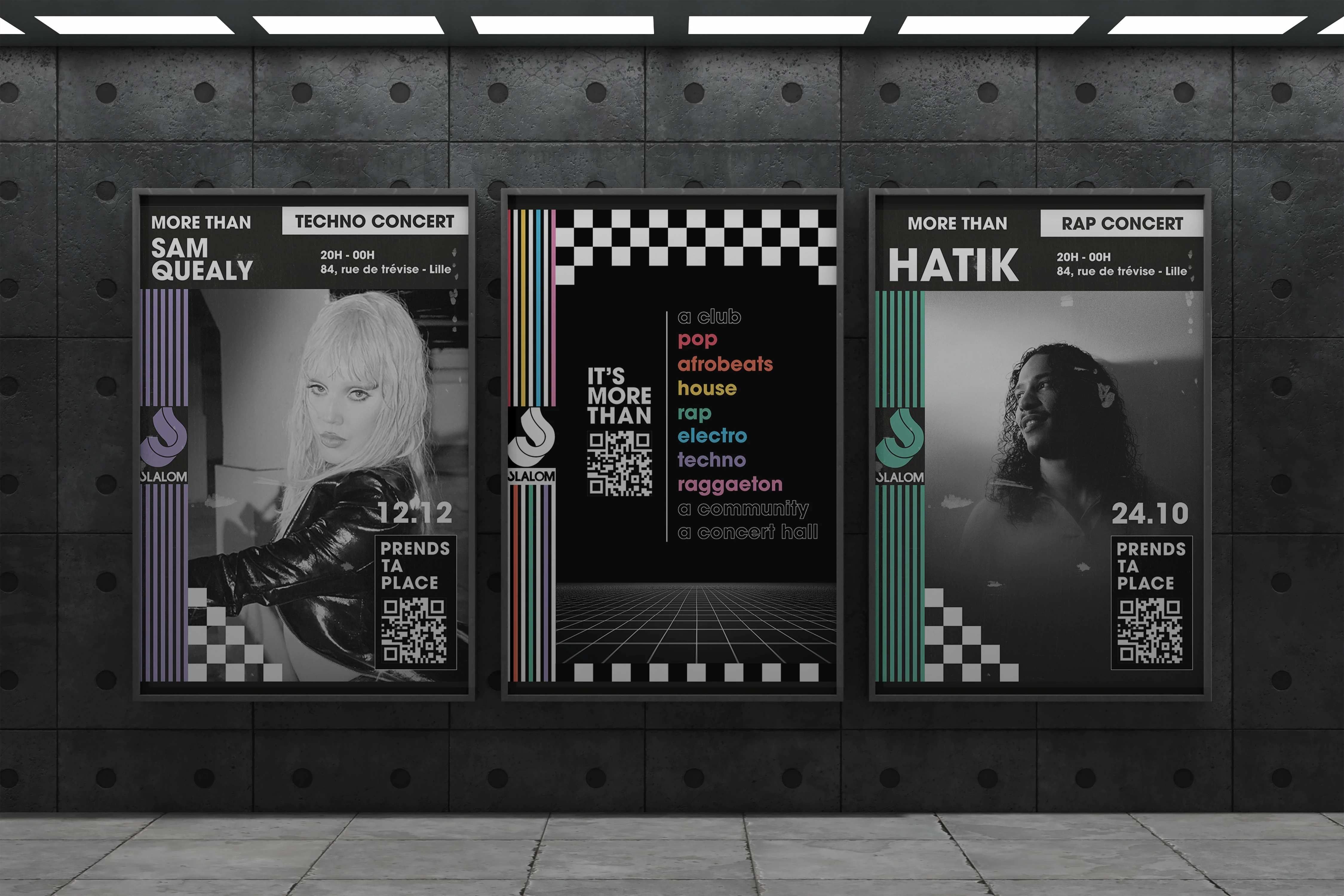 L’idée était de proposer plusieurs identités visuelles afin de mettre en avant la diversité des styles musicaux proposés par Slalom. Pour détacher le lieu de son image de club “techno” tout en respectant son univers graphique, j’ai utilisé la couleur pour distinguer chaque scène musicale et les valoriser. L’objectif était aussi de renforcer un sentiment de communauté autour de ces visuels.